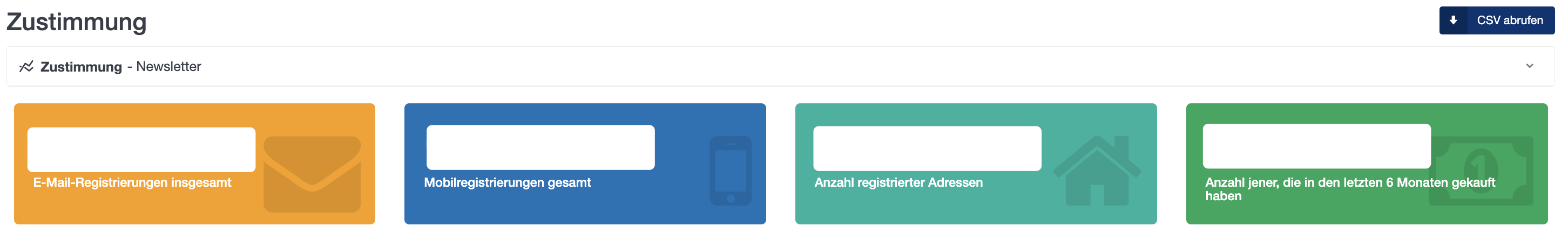 Im Bericht Zustimmungen über Reporting > Zustimmungen kann ein Bericht mit den E-Mail-Adressen oder Telefonnummern der Personen mit der gewählten Zustimmung erstellt werden. Klicken Sie dann auf Bericht ausführen und CSV herunterladen.