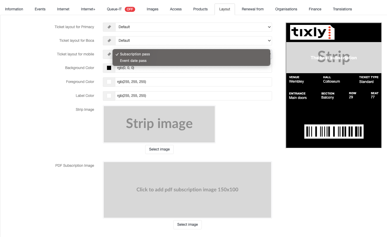 - Upload an image that can be printed on the PDF subscription ticket layout provided that the variable is available in the layout.
