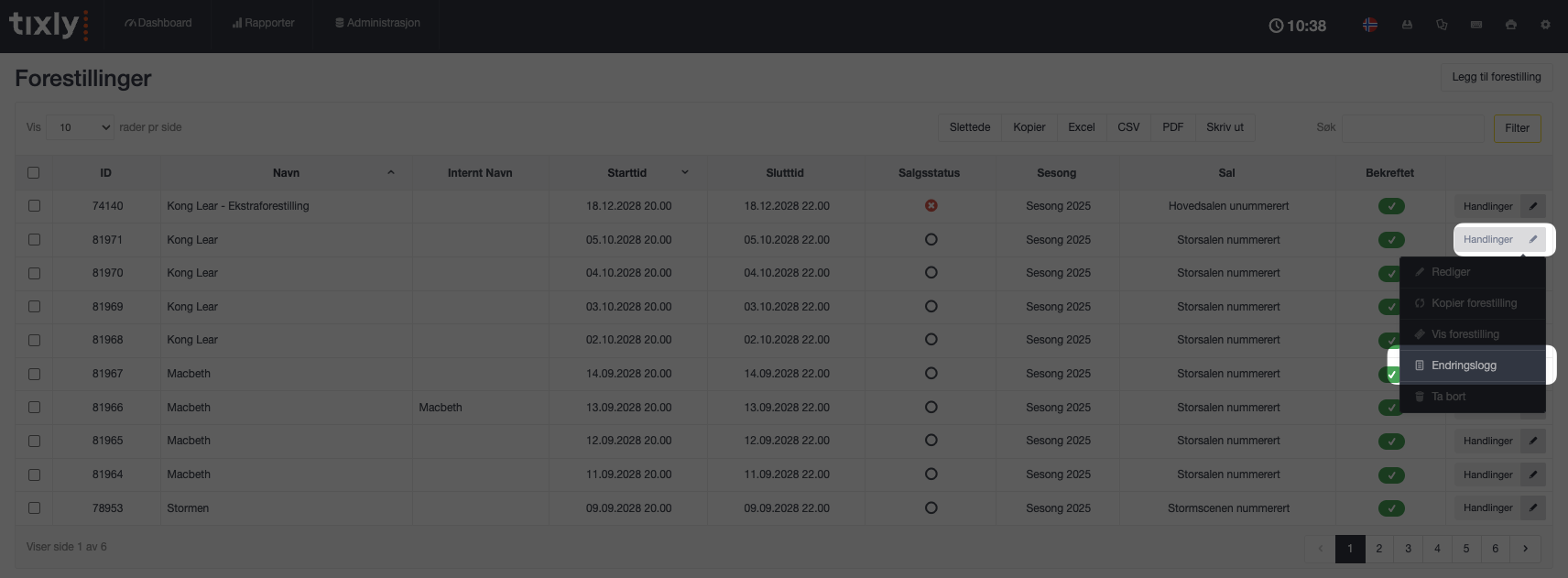 For å åpne endringsloggen, gå til Administrasjon > Forestillinger > Forestillinger. Finn ønsket forestilling, klikk på Handlinger og velg Endringslogg.