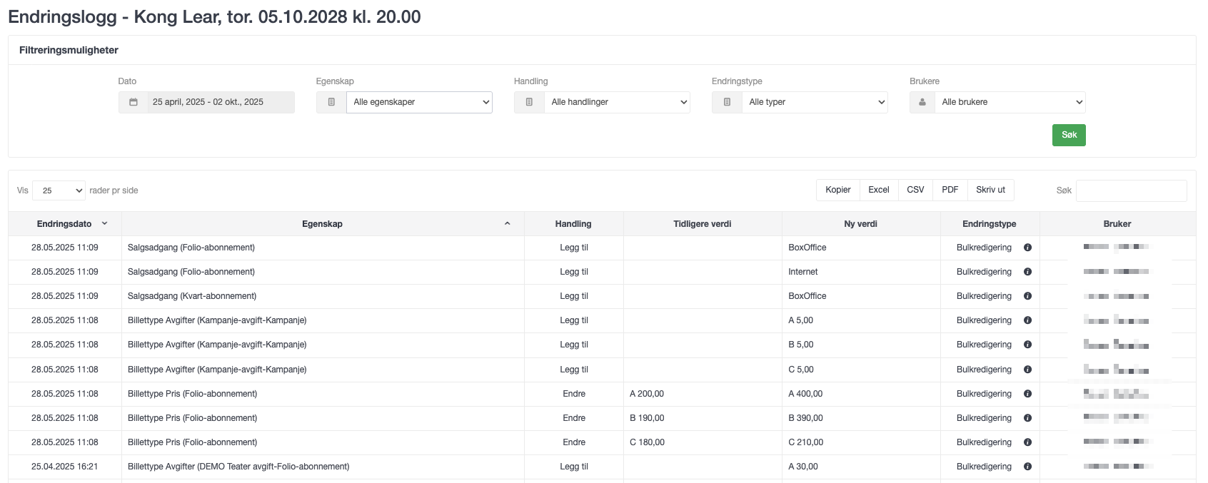 Endringsloggen lar deg spore endringer som er gjort på forestillinger, inkludert hva som ble endret, når det ble endret, hvilken bruker som gjorde endringen, og om det ble brukt på flere forestillinger gjennom bulkredigering eller ikke. Endringer gjort via admin-APIet er også inkludert i endringsloggen.