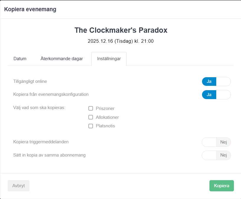 Under fliken inställningar kan man bestämma vilka inställningar som skall kopieras till de nya evenemangsdatumen.