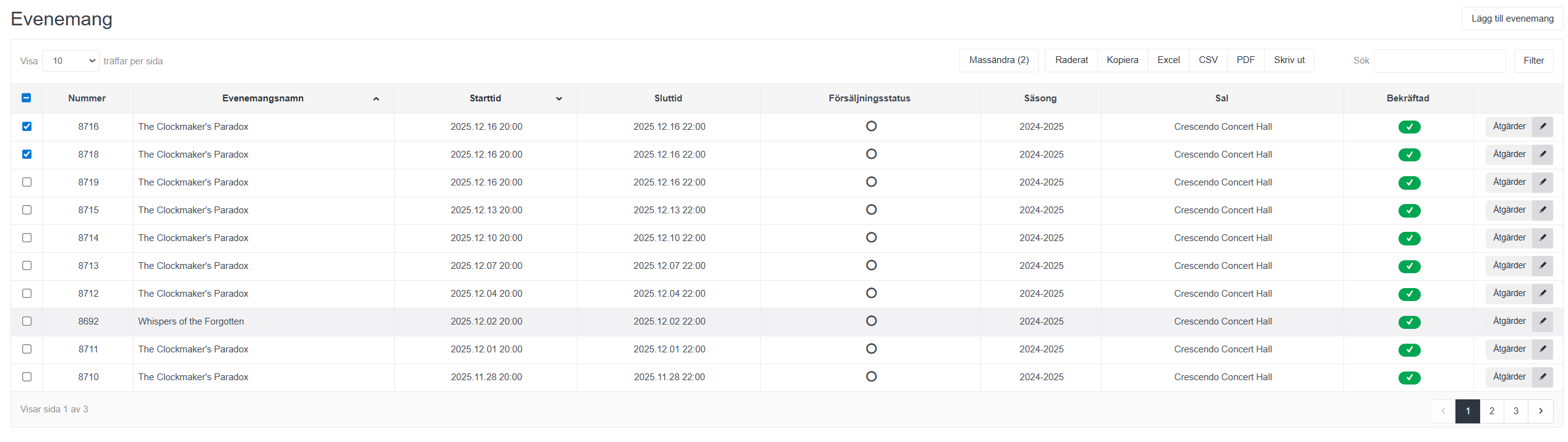 Funktionen för massändring gör det möjligt att snabbt redigera flera evenemang på en gång. Gå till Administration > Evenemang och välj alla evenemang som ska redigeras. Använd antingen sökfältet för att söka efter alla evenemang från en specifik produktion eller använd det avancerade filtret för att söka efter evenemang på specifika dagar/tider, arrangör, kategori etc. När du har valt alla datum trycker du på knappen Massändra som visas bredvid alla exportalternativ